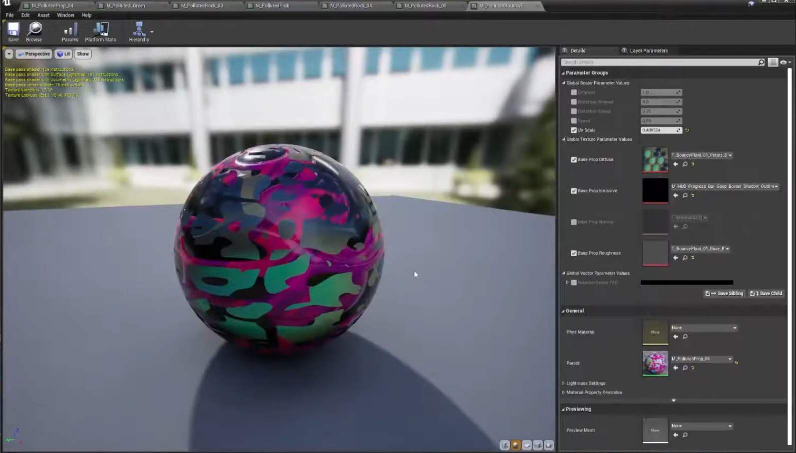 Along with maintaining the animation blueprints, I also provided assistance with other art-related aspects of the project. One example was helping with the materials of our game. In our game, we have pollution spheres that when next to props, will cause a pollution overlay on top of the object itself. This was done by turning the material of the prop into a material instance and using a material function that created the goopy pollution texture. Once it was a material instance I added a float to act as the opacity of the goop to have it slowly fade away as the player cleaned the area.